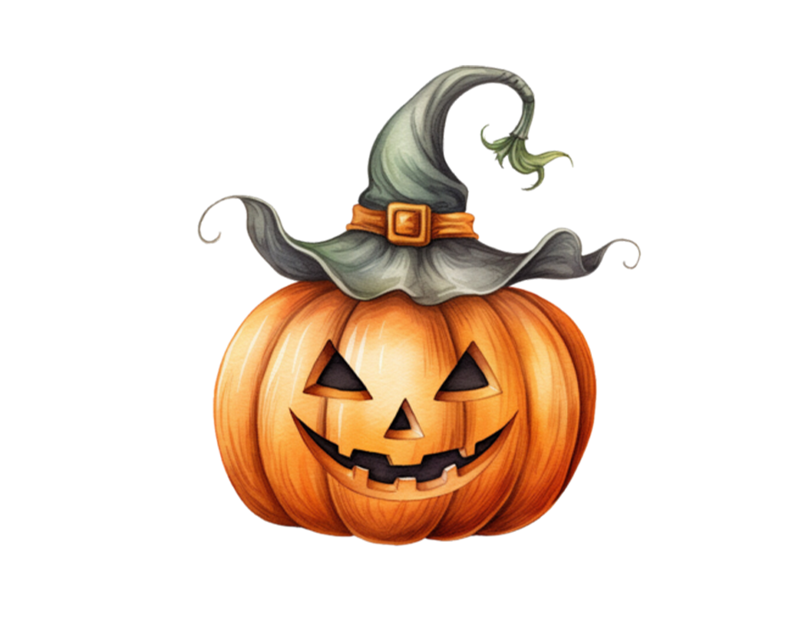 A watercolor-style Halloween illustration featuring an orange Jack-o'-lantern (carved pumpkin) with a carved, grinning face, topped with a frayed, pointed witch's hat, set against a transparent background.