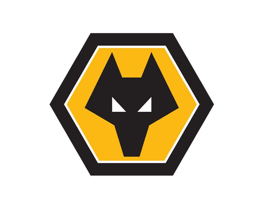 The Wolverhampton Wanderers FC logo, featuring a stylized black wolf's head silhouette with pointed ears and piercing white eyes, set within a gold hexagonal frame on a black background.